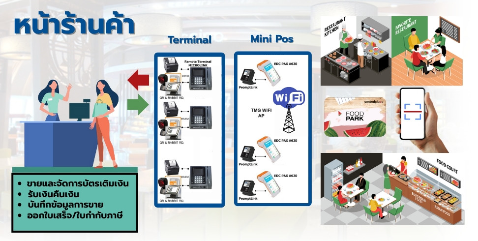- การออกบัตรและเติมเงิน (Card Issuing & Top-up): เป็นจุดที่ลูกค้าสามารถแลกซื้อบัตรศูนย์อาหาร (Cash Card) และเติมเงินเข้าบัตรด้วยเงินสด, บัตรเครดิต/เดบิต, หรือช่องทางอิเล็กทรอนิกส์อื่นๆ